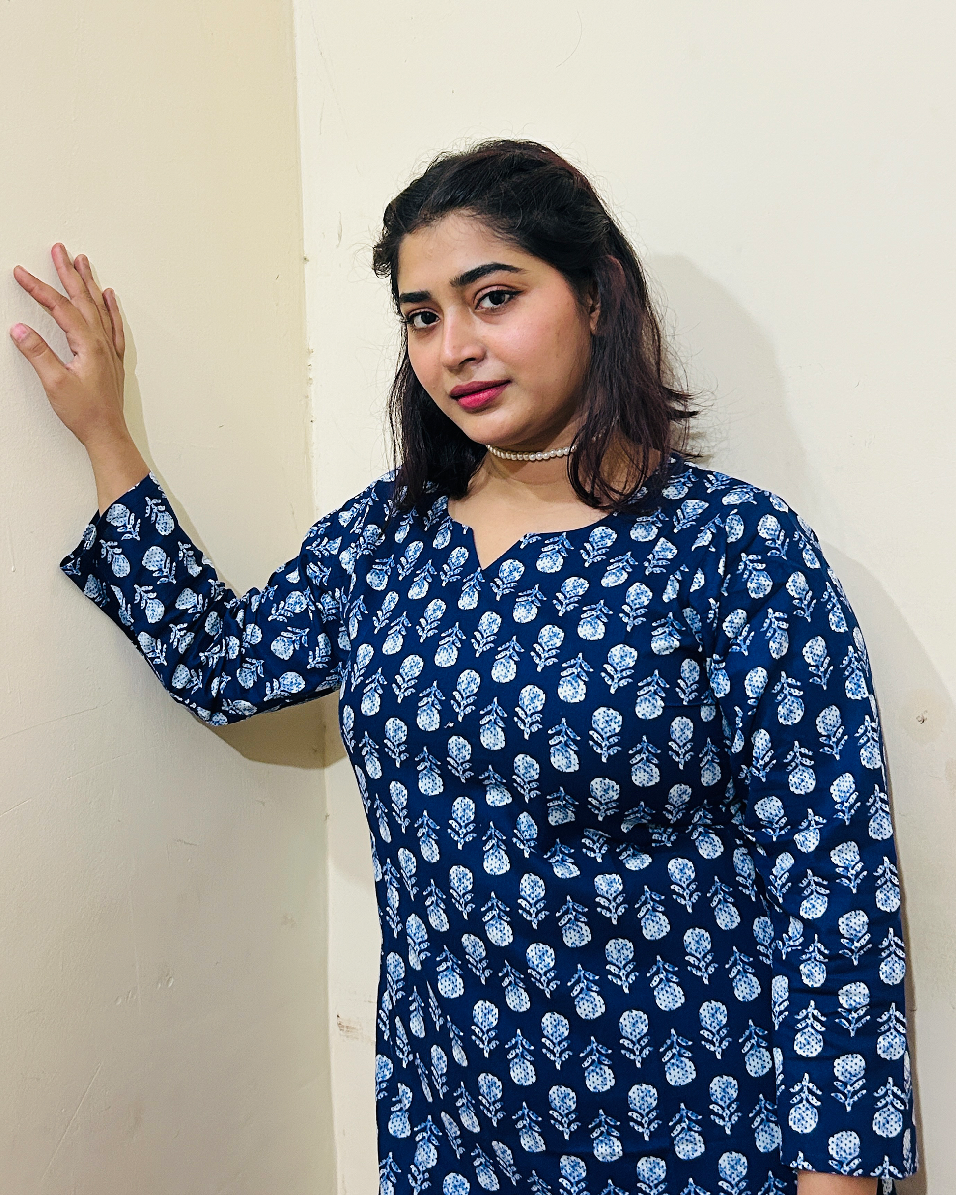 The Afsana Notch Neck Kurti features a rich navy blue base with delicate white floral prints for a timeless everyday look. Designed with a soft notch neckline, three-quarter sleeves, and a comfortable straight fit, it offers breathable all-day comfort. Easy to style with jeans, leggings, or palazzos, this kurti is perfect for work, college, and casual outings.