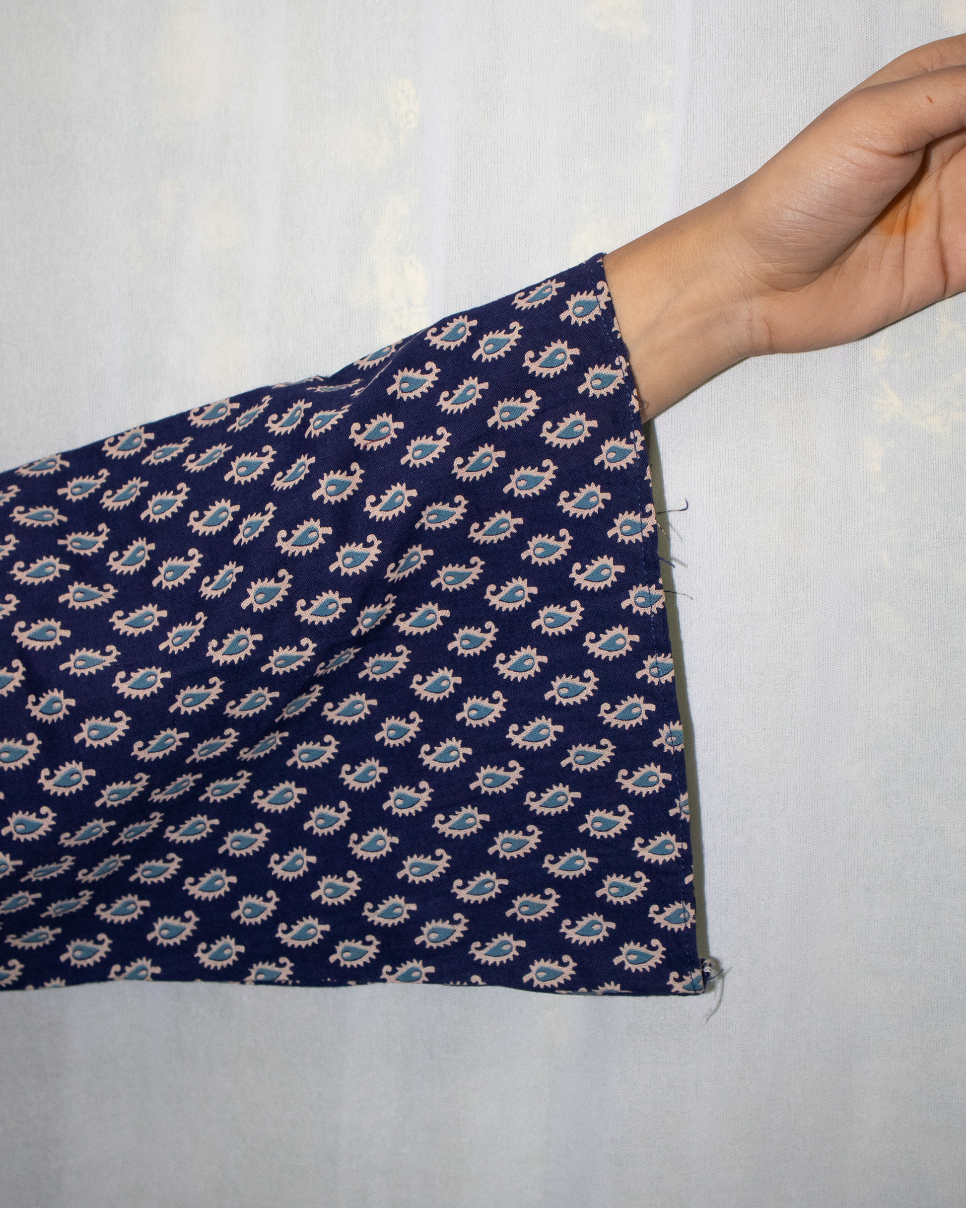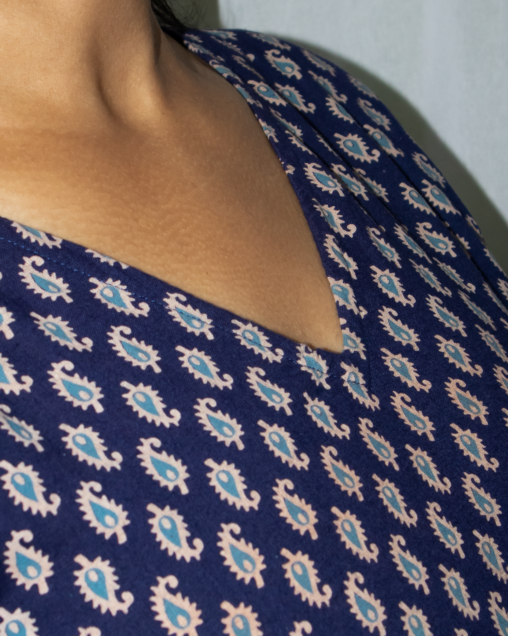 The Arzoo V-Neck Bell Sleeve Kurti is crafted for women who love subtle sophistication. Its navy blue palette is adorned with delicate all-over prints that give it a timeless, hand-crafted appeal. The V-neckline frames the face elegantly without being too deep, offering a perfect balance of modesty and modernity.