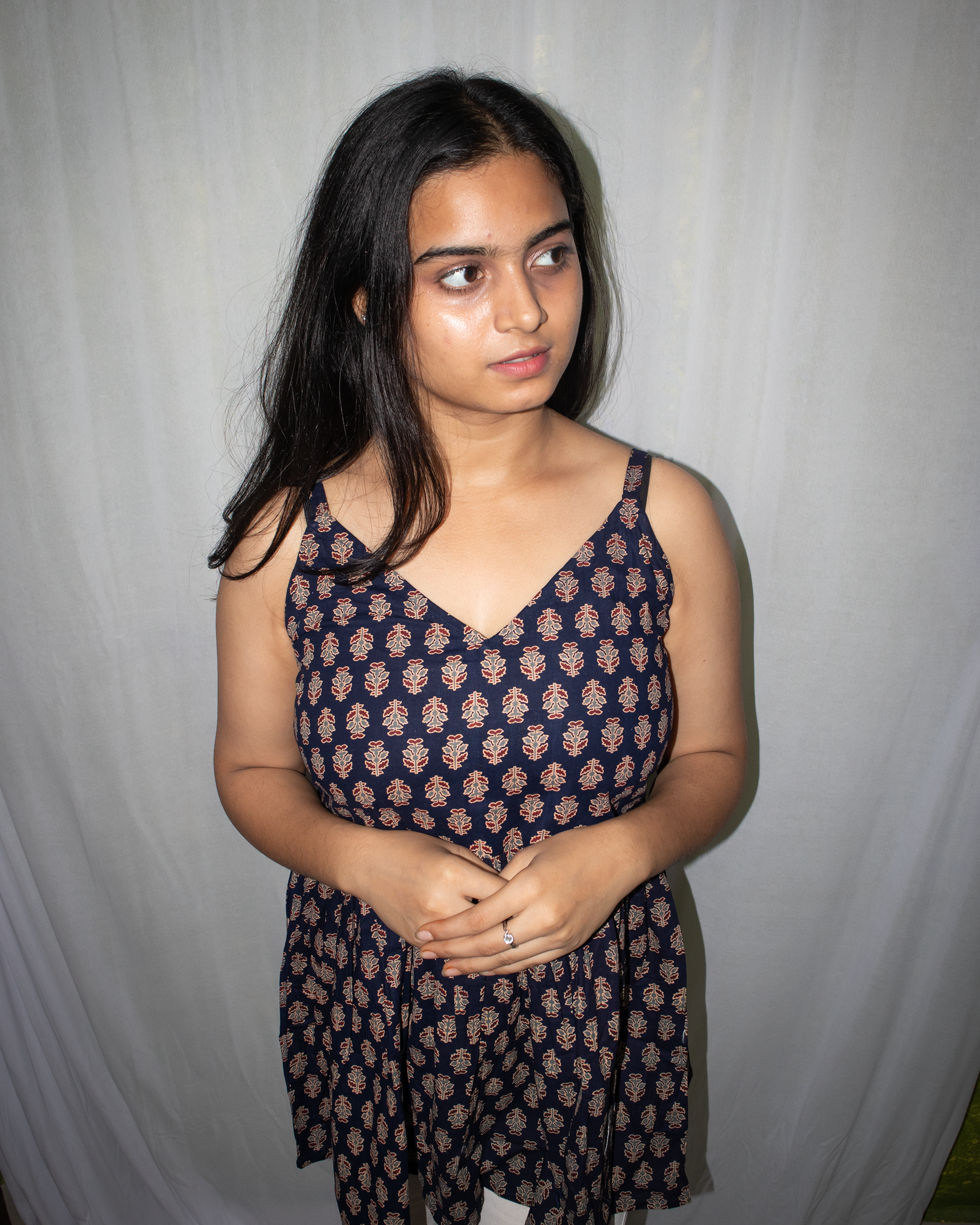 The Inaya Sleeveless Flared Top is crafted for women who love light, airy, and stylish everyday outfits. Its navy blue base is adorned with intricate hand-block inspired motifs that add character without overpowering your look. The delicate spaghetti straps give a minimal yet modern touch, while the V-shaped neckline flatters the neckline gracefully.