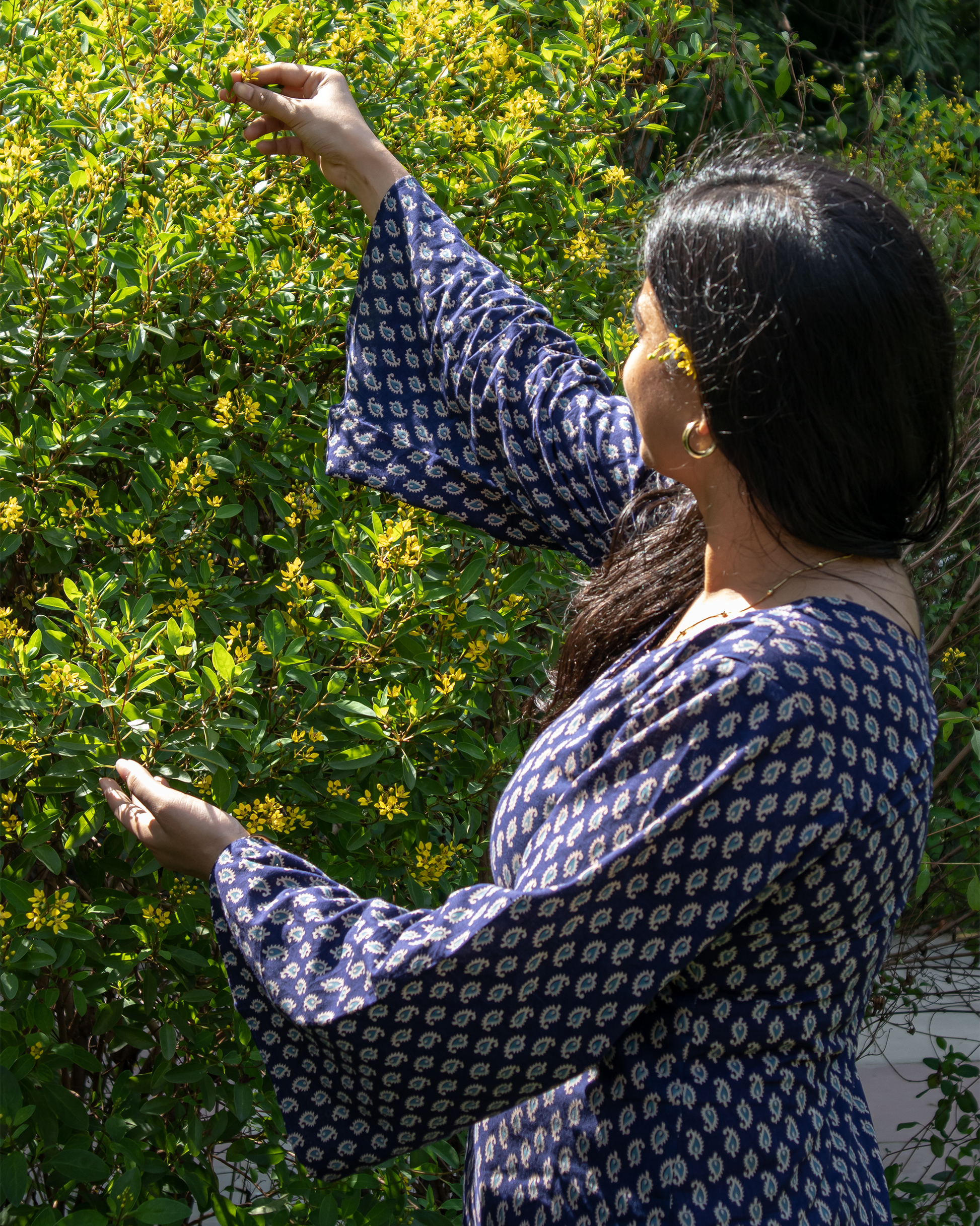 Ziyaara’s Midnight Bloom Bell Sleeves Short Kurti is designed in a rich navy shade with elegant handblock prints. Featuring a V-neckline and flowy bloom bell sleeves, this short kurti is perfect for pairing with trousers, denims, or palazzos – ideal for casual outings, college, or office wear.